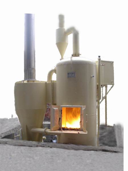 二燃室为一垂直于地面的圆柱型筒体,其主要作用是对回转窑体未燃烬的有害物质作进一步的高温分解,同时也可将部分液体废物喷入焚烧。为了使未燃烬物质彻底分解,二燃室设有二次进风装置和发生炉煤气喷嘴,以保证烟气在高温下同氧气充分接触和烟气在二燃室的滞留时间。二燃室进风量的大小可根据其出口烟气的含氧量自动调整。二燃室为耐火砖结构,内部为高铝耐火层,以珍珠岩和硅酸铝纤维毡作保温层,外部为耐热钢板。为保证系统的安全性,在二燃室的顶部设有紧急排放安全阀。紧急排放安全阀可根据事先设置的开启条件自动打开