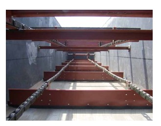 SCP型链板式刮泥机主要由驱动装置、主动轮组、导轨及托架、刮板组合、从动轮组、链条涨紧机构、集渣管等部件组成。